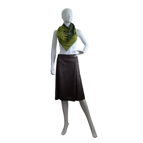 Das Klappen des Rockes beim Gehen symbolisiert Bewegung und Wandel, doch die Farbe ruft stets zurück zur Mitte. Khaki schenkt Gelassenheit, innere Balance und die Kraft, inmitten der äußeren Veränderungen die Wurzeln nicht zu verlieren. So wird der Rock zu einem Kleidungsstück, das nicht nur den Körper bedeckt, sondern auch die Seele erdet.